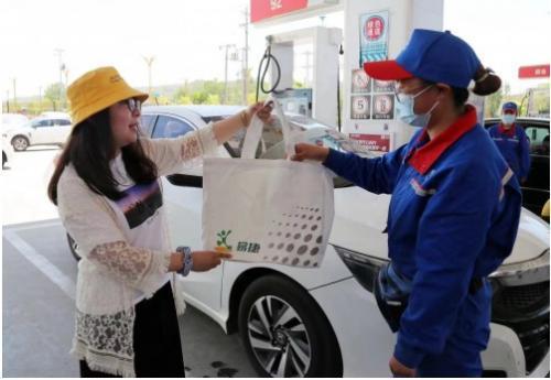 圖為中國石化青海石油分公司(sī)的加油站員工向客戶贈送環保(bǎo)購物袋